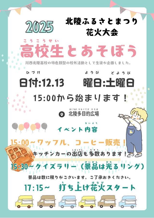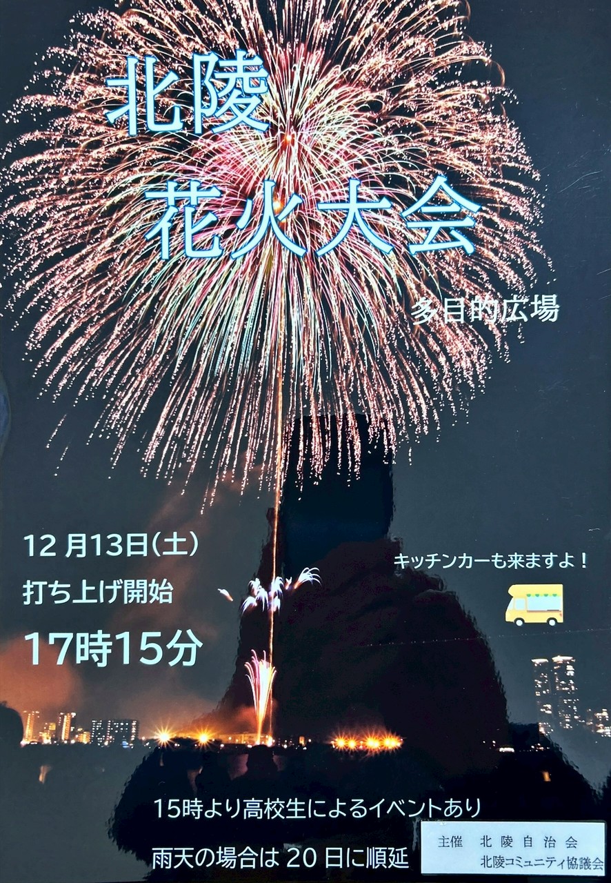 北陵花火大会 2025/12/13(土) イベント 2025.12.062025.12.13 北陵花火大会 2025/12/13(土) 12/13(土)、北陵多目的広場で「北陵花火大会」を開催します。高校生によるイベントやキッチンカーの出店もあります。暖かい服装でお越しください。 【概要】 日時:2025/12/13(土)15:00〜(花火の打ち上げは17:15〜) 場所:北陵多目的広場 主催:北陵自治会、北陵コミュニティ協議会 ※雨天時は、12/20(土)に順延
