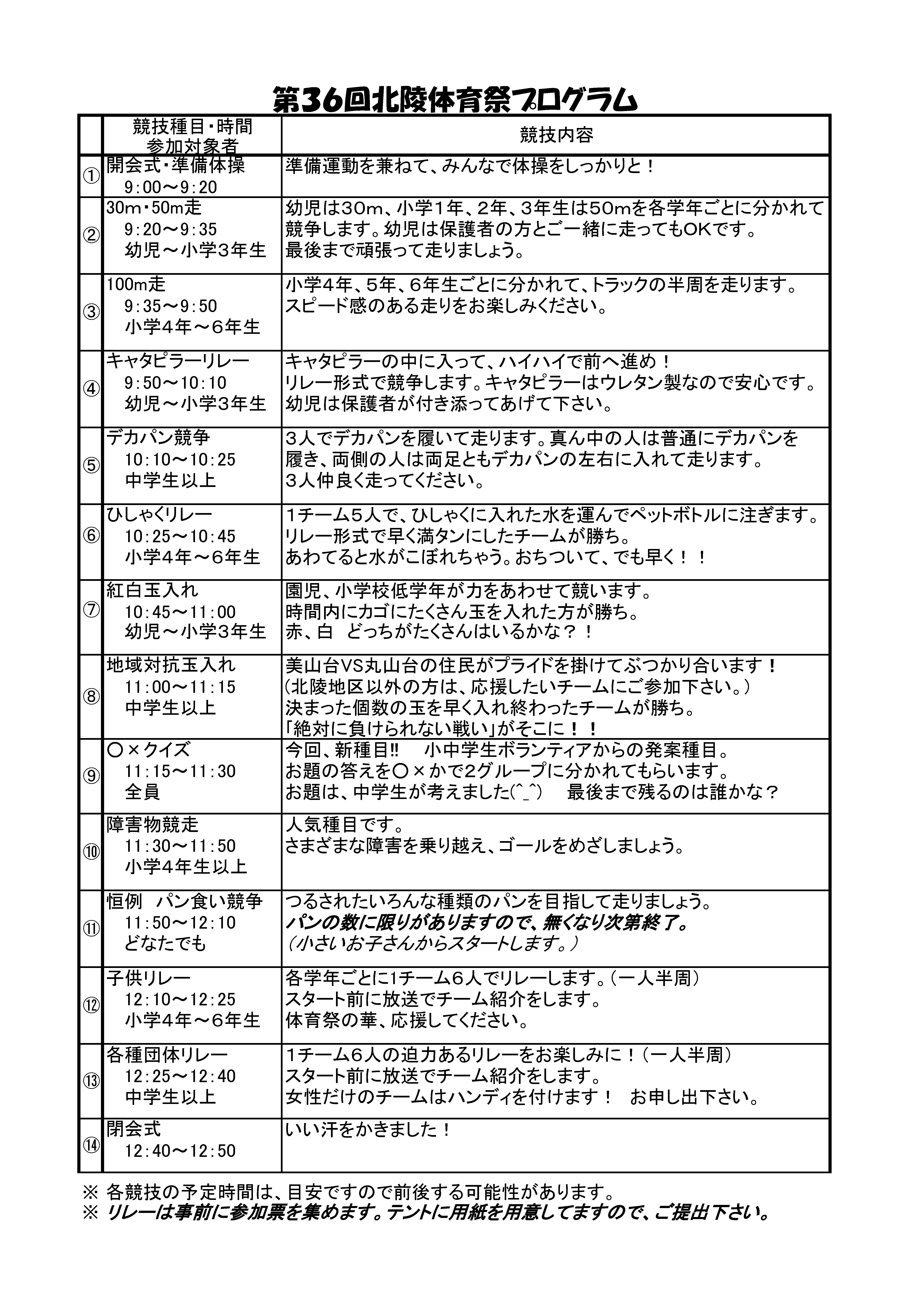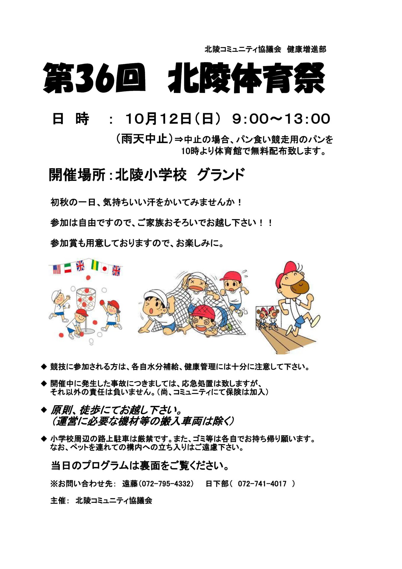 第36回 北陵体育祭 2025/10/12(日) イベント 2025.09.01 第36回 北陵体育祭 2025/10/12(日) 初秋の一日、気持ちいい汗をかいてみませんか! 参加は自由ですので、ご家族おそろいでお越し下さい!! 参加賞も用意しておりますので、お楽しみに。 ■概要 ・日時:2025/10/12(日)9:00〜13:00 ・場所:北陵小学校グラウンド <徒歩でお越しください> ※雨天中止。中止の場合、パン食い競走用のパンを10時より体育館で無料配布致します。