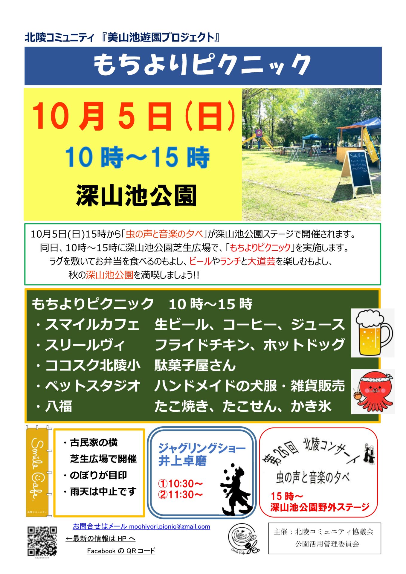 また、同日10:00〜15:00には、スマイルカフェ によるイベント「もちよりピクニック」を芝生広場で開催。スマイルカフェによる生ビールやコーヒー、ジュースの販売、カフェスリールヴィさん(フライドチキン、ホットドッグの販売)、ココスク北陵小による駄菓子屋さん、ペットスタジオさん(ハンドメイドの犬服・雑貨販売、ペットのデジタルイラスト)、八福さん(たこ焼き、たこせん、かき氷)のほか、井上卓磨さんによるジャグリングショー(10:30〜、11:30〜)もあります。